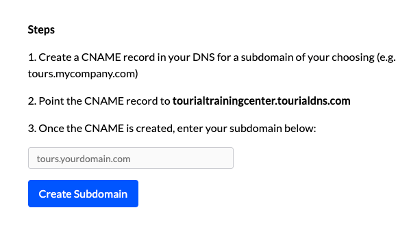 *Note: Visitors will not interact with the subdomain itself; creating it simply allows you to serve the tour from your domain rather than Tourial's domain.*
