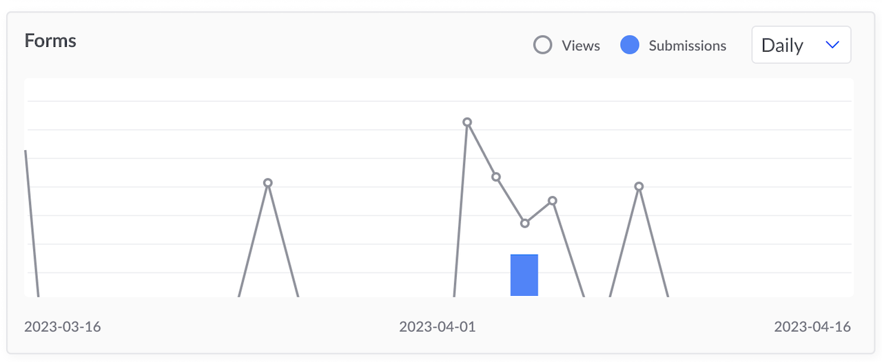 Compare form views and submissions across a selected timeframe. You can also arrange the data using the dropdown for Daily, Weekly, or Monthly views.<br>