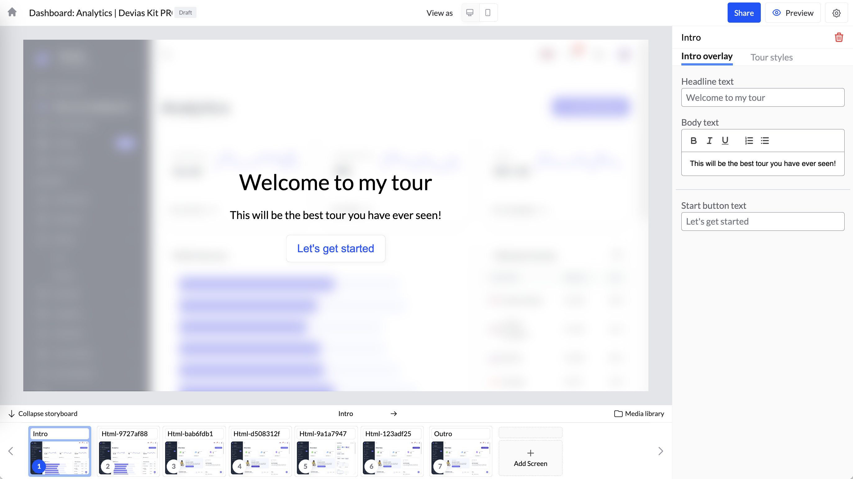 4. When you go to your Tourial project, you'll see your pages at the bottom and an intro screen that's automatically created. <br>